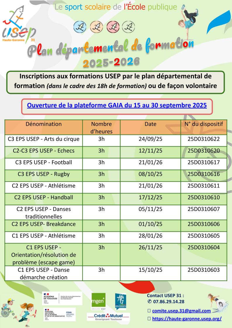 Dans cette perspective, à l’appui de nos partenariats (comités sportifs notamment), 11 actions de formation organisées par le comité USEP 31 sont intégrées au plan départemental de formation 2025-2026.